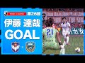 - 右足一閃。伊藤達哉がコンパクトな一振りでゴール左隅を射抜く。