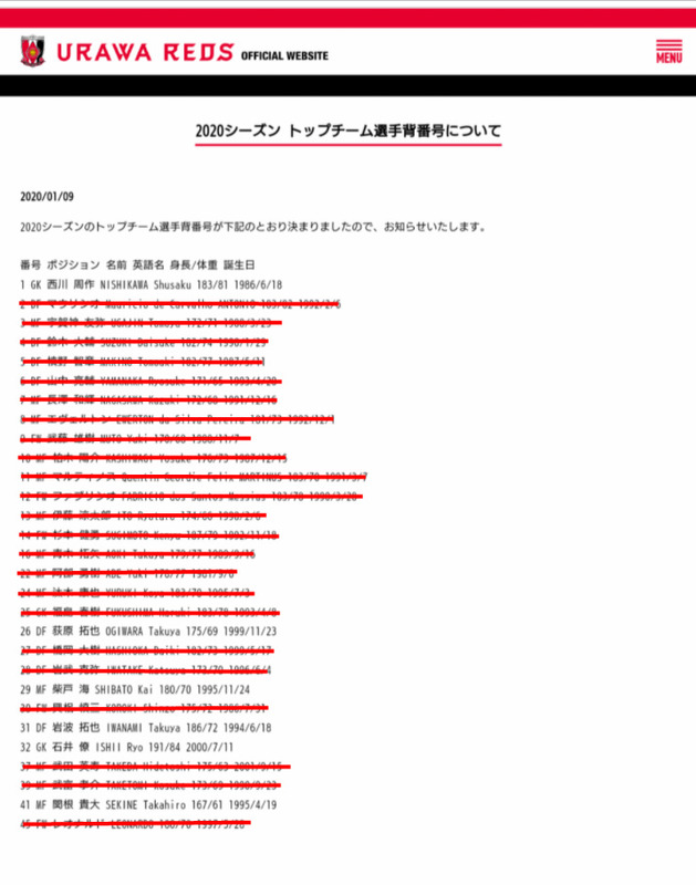 - ◆J小ネタ◆浦和の2020年の選手リストで放出済み選手を赤線で消してみた結果www